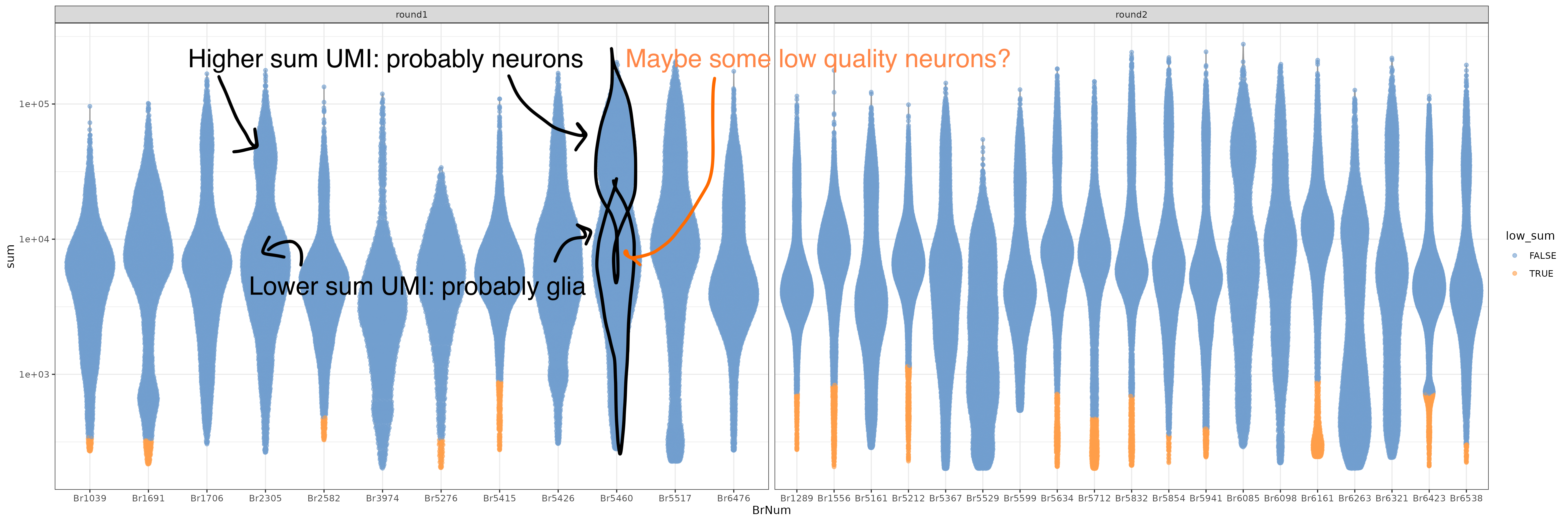 After nuclei QC, you’ll retain high QC nuclei with double scores, ready for clustering! But notably when evaluating brain snRNA-seq data, neurons have high levels of transcriptional activity than glia leading to different distributions of these QC metrics. This is visible in the bi-modal distributions of the nuclei sum UMI QC plots. Some of the nuclei that look fine might be low quality neurons, but we don’t know which neurons are neurons yet 🕵️! To understand what type of cells these nuclei are we’ll have to cluster.