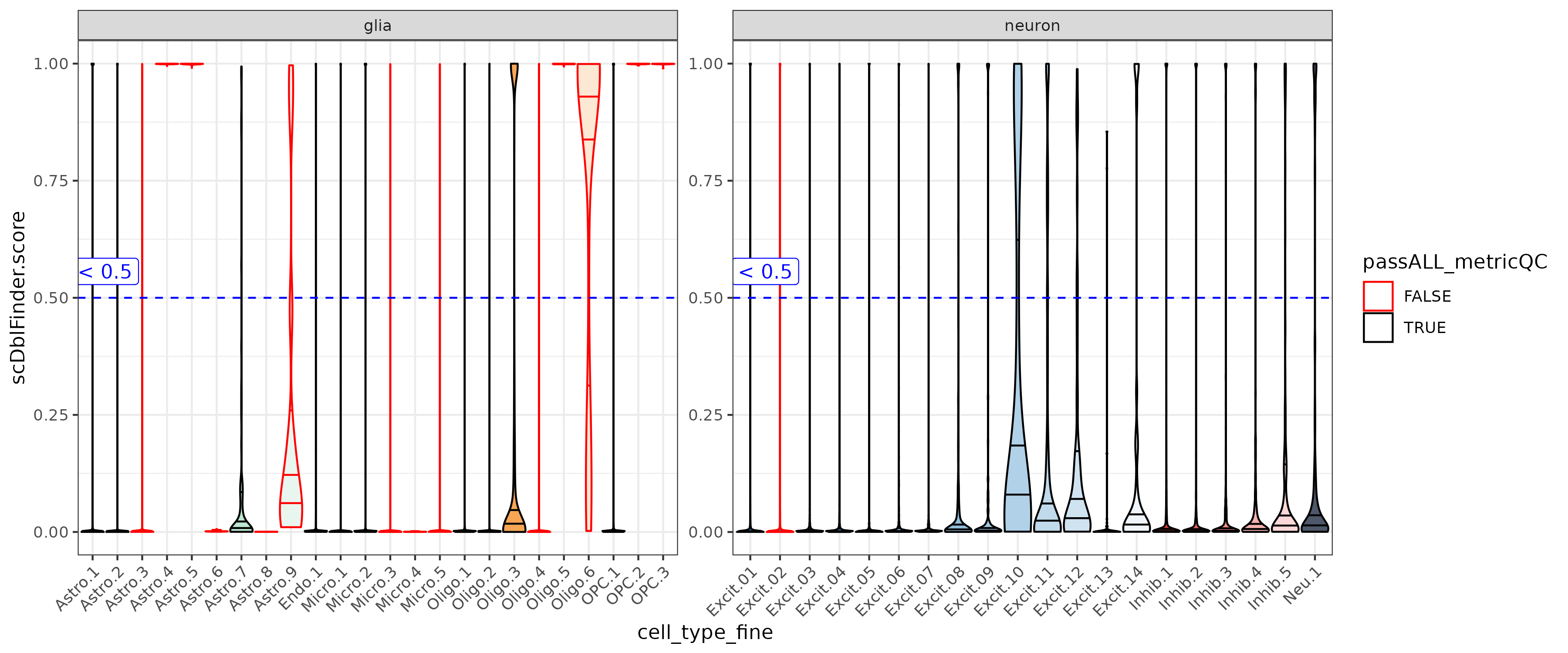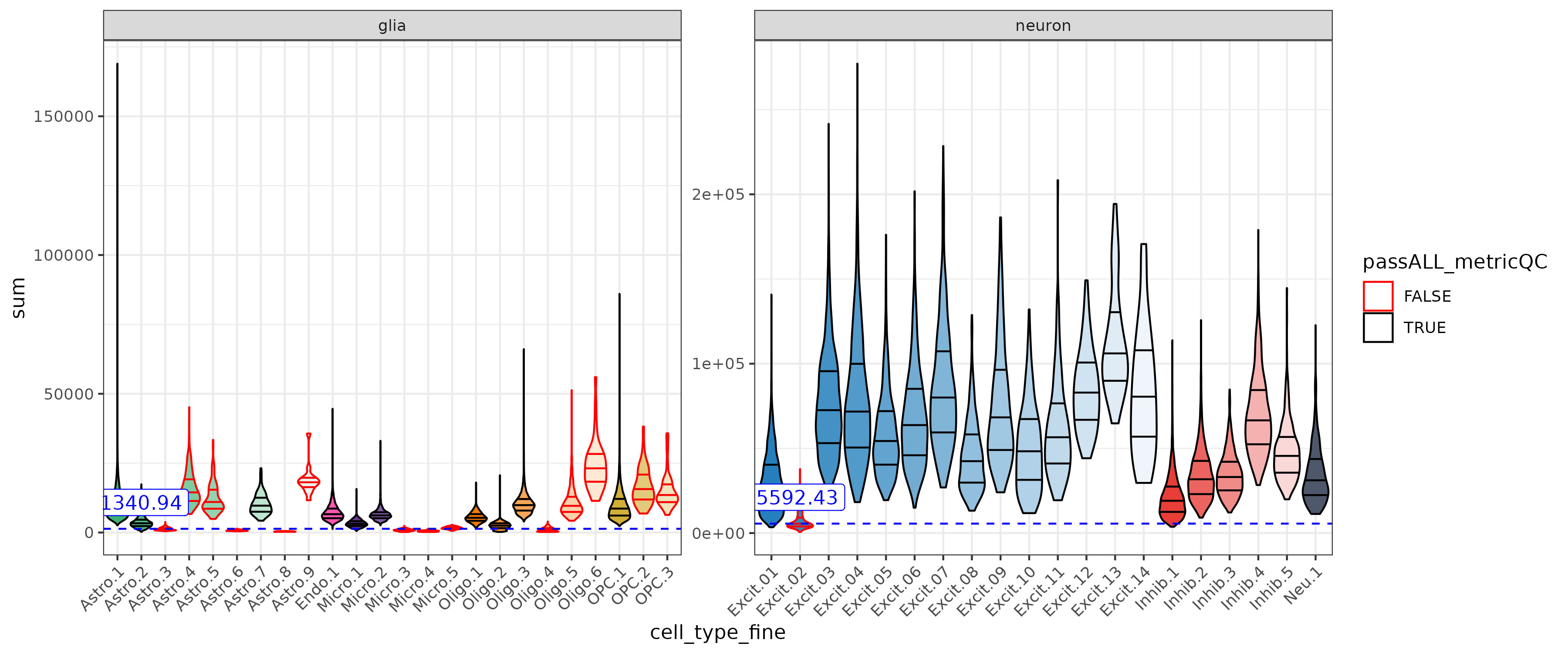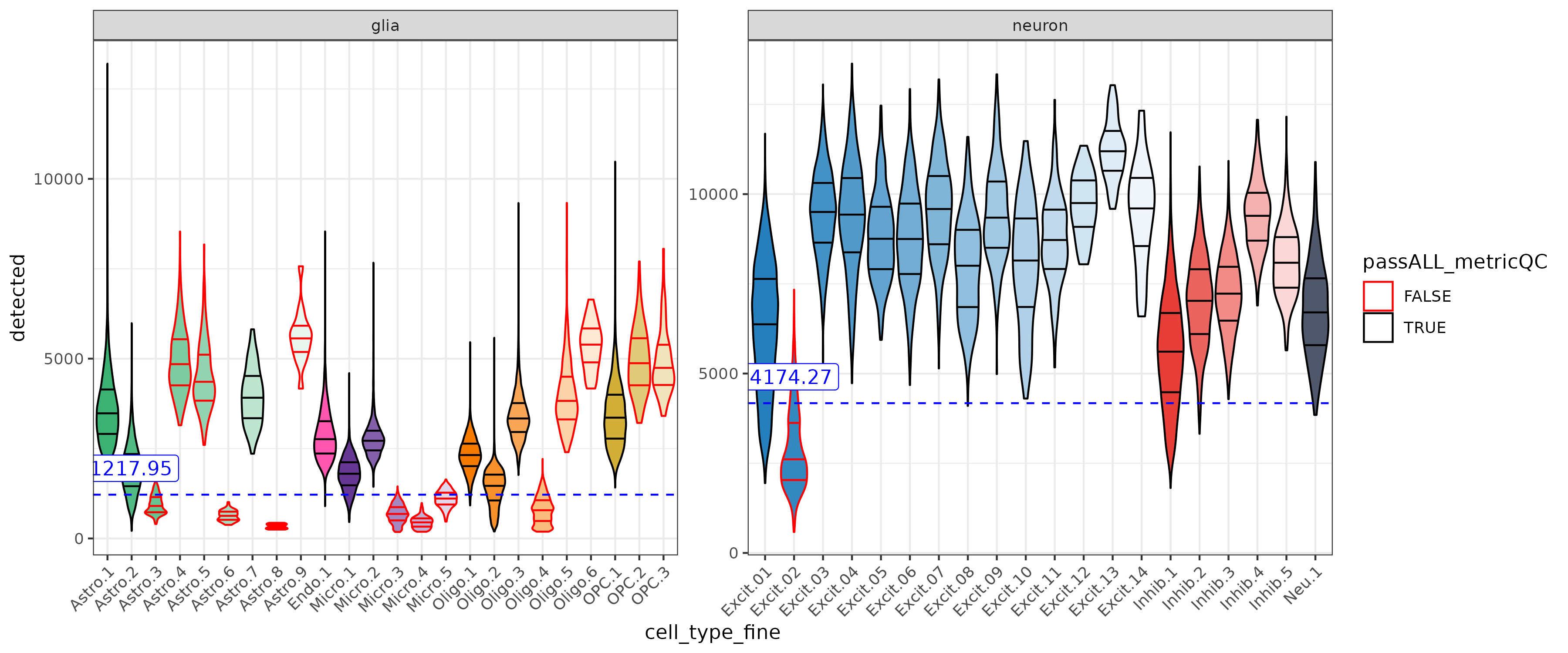 These metrics have different ranges between gila and neurons. With the adjusted cutoffs low quality neurons (ex. Excit.2) can be detected with out loosing too many glia.