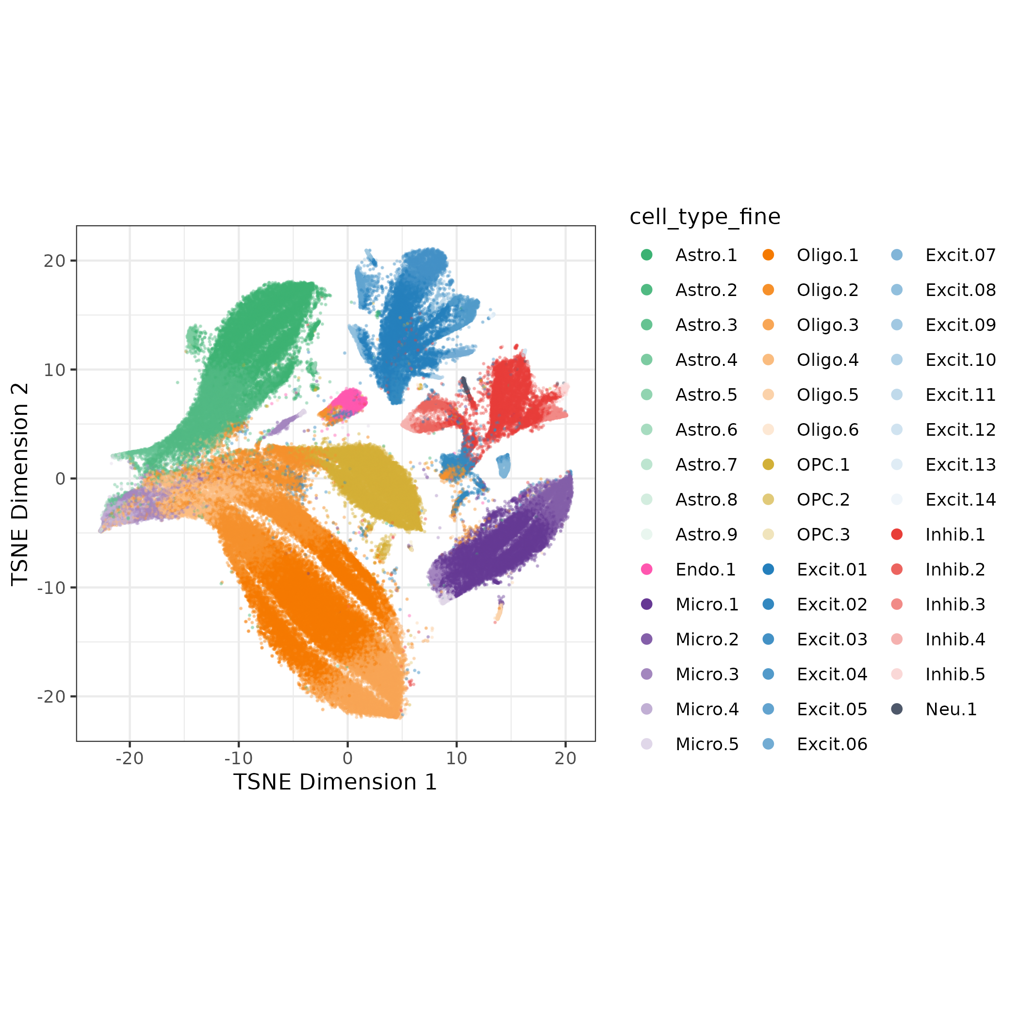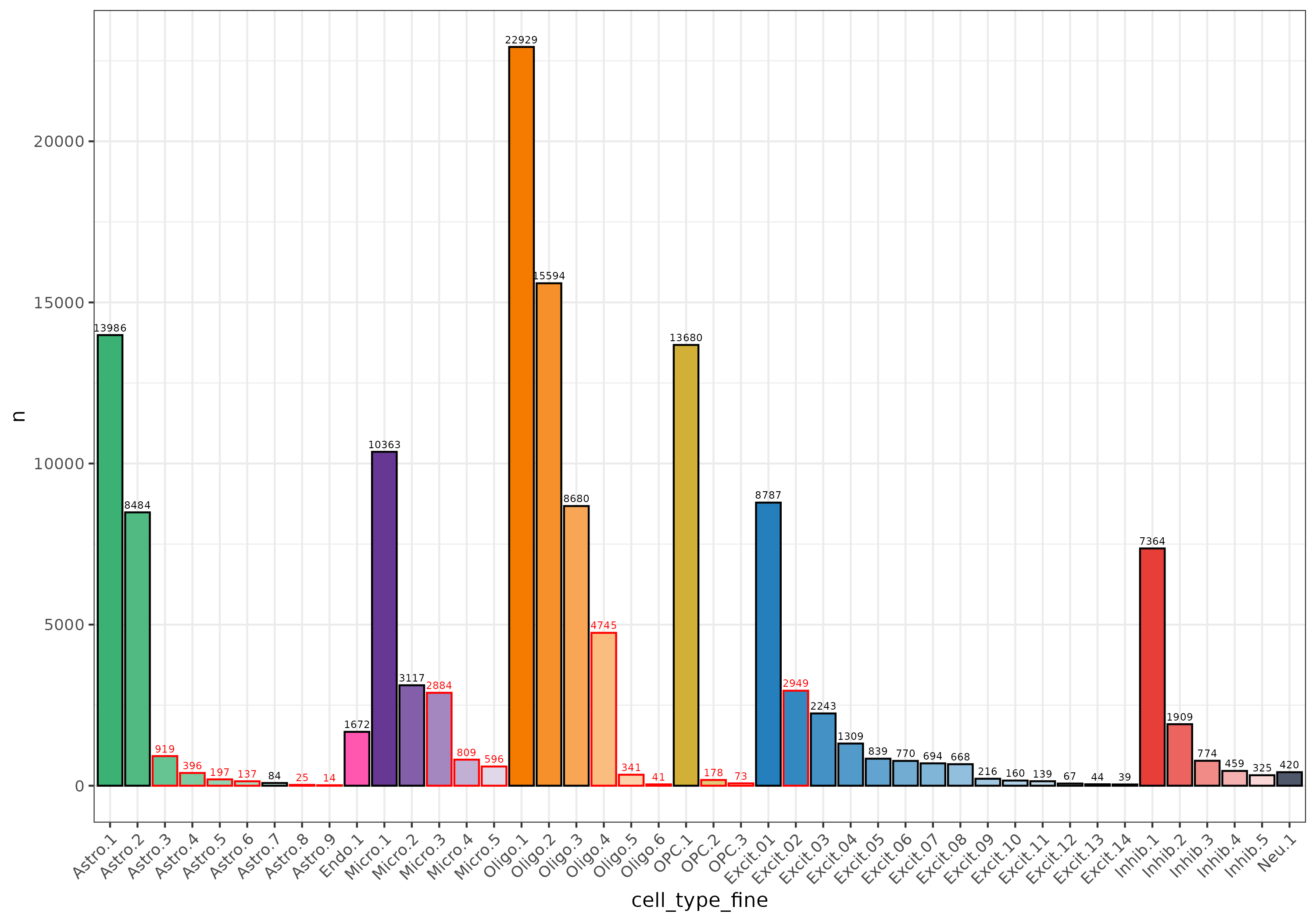 I also assigned cell_type_fine as a combination of cell_type_broad and rank of number of nuclei within a cell type (so the Astrocyte cluster with most nuclei is Astro.1). Now I have a name and cell type annotation for all 44 clusters! ✅